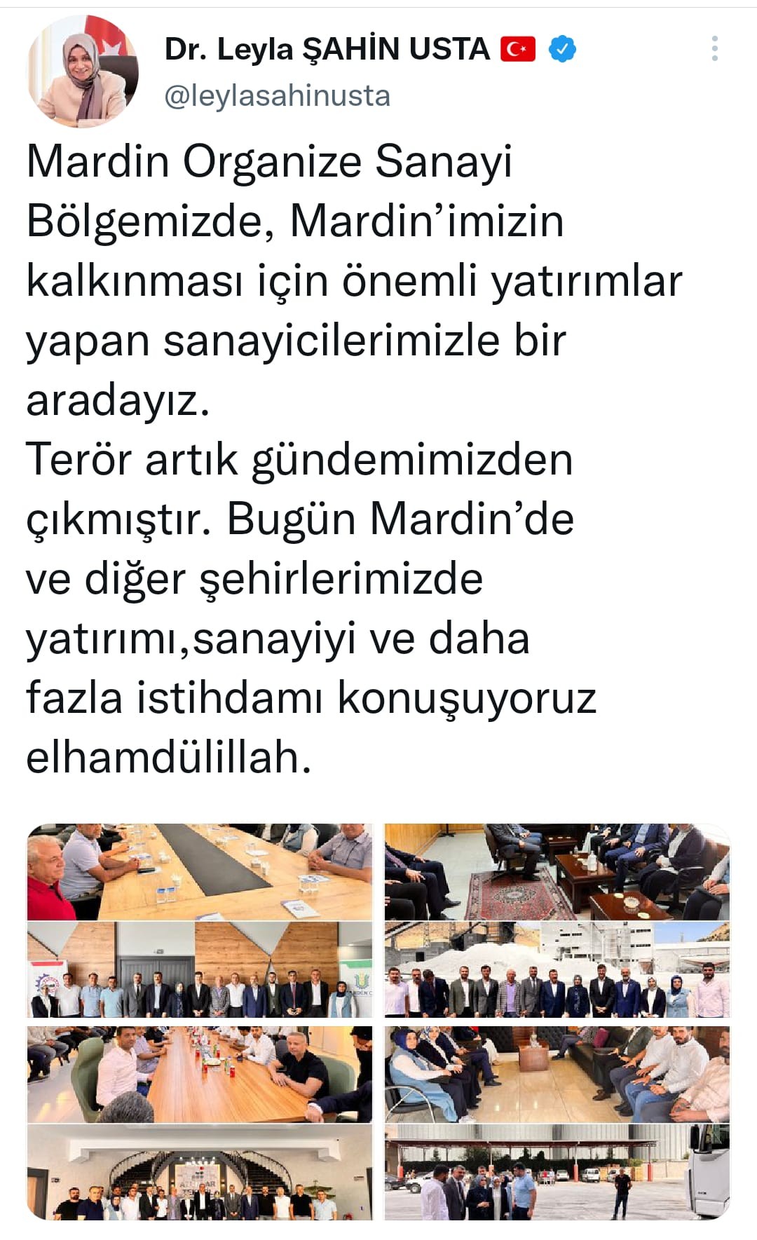 AK Parti Genel Başkan Yardımcısı ve Konya Milletvekili Leyla Şahin Usta, "Mardin Organize Sanayi Bölgemizde, Mardin’imizin kalkınması için önemli yatırımlar yapan sanayicilerimizle bir aradayız. Terör artık gündemimizden çıkmıştır. Bugün Mardin’de ve diğer şehirlerimizde yatırımı,sanayiyi ve daha fazla istihdamı konuşuyoruz elhamdülillah" ifadelerini kullandı.