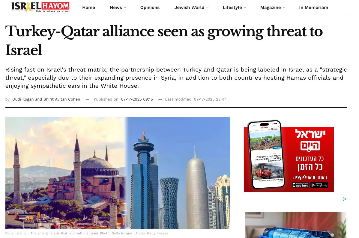 Türkiye ve Katar arasında derinleşen stratejik ortaklık, İsrail için en büyük tehdiklerden biri olarak ifad eedilen analizde, özellikle Suriye’deki genişleyen Türk-Katar etkisi, her iki ülkenin Hamas yetkililerine ev sahipliği yapması ve Beyaz Saray’da olumlu karşılanmaları, Tel Aviv’i rahatsız ettiği yazıldı.
