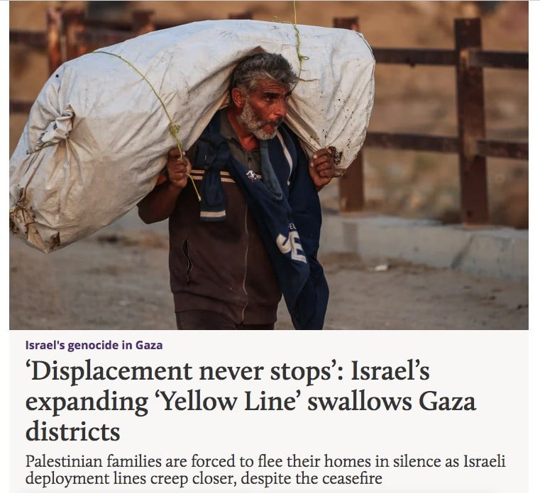 Haberde şu ifadeler kullanılıyor: “Hamit ve ailesi ilk başta patlamaların çok uzakta olduğunu düşünmüş, Sarı Hat’tın halen uzakta olduklarına inanmışlar. Ama şimdi Hamid penceresinden İsrail güçleri tarafından yerleştirilen sarı beton blokları görebiliyor. Bu, birkaç hafta önce orada olmayan bir manzara. Gazze genelinde, İsrail’in geçici sınır çizgisi kayarak nüfusun yoğun olduğu bölgelere daha da yaklaşıyor. Bu da İsrail’in yeniden yerinden etme ve şiddet uygulama korkularını körüklüyor.