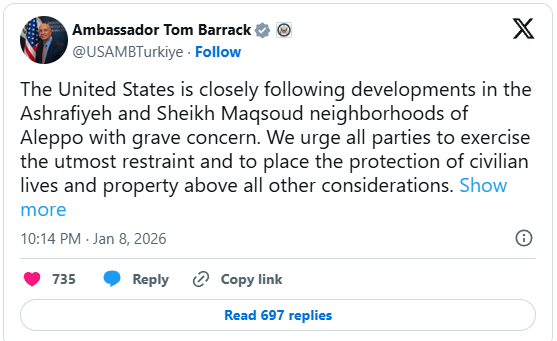 Suriye ordusunun Halep'te başlattığı kararlı harekatla inleri başına yıkılan PKK-SDG'li teröristlerin imdadına yine "efendileri" yetişti. ABD'nin Suriye Özel Temsilcisi Tom Barrack, teröristlerin Eşrefiye ve Şeyh Maksud’da köşeye sıkışması üzerine apar topar bir açıklama yaparak, "endişeliyiz" nakaratına sarıldı.