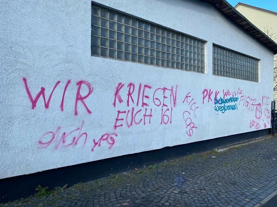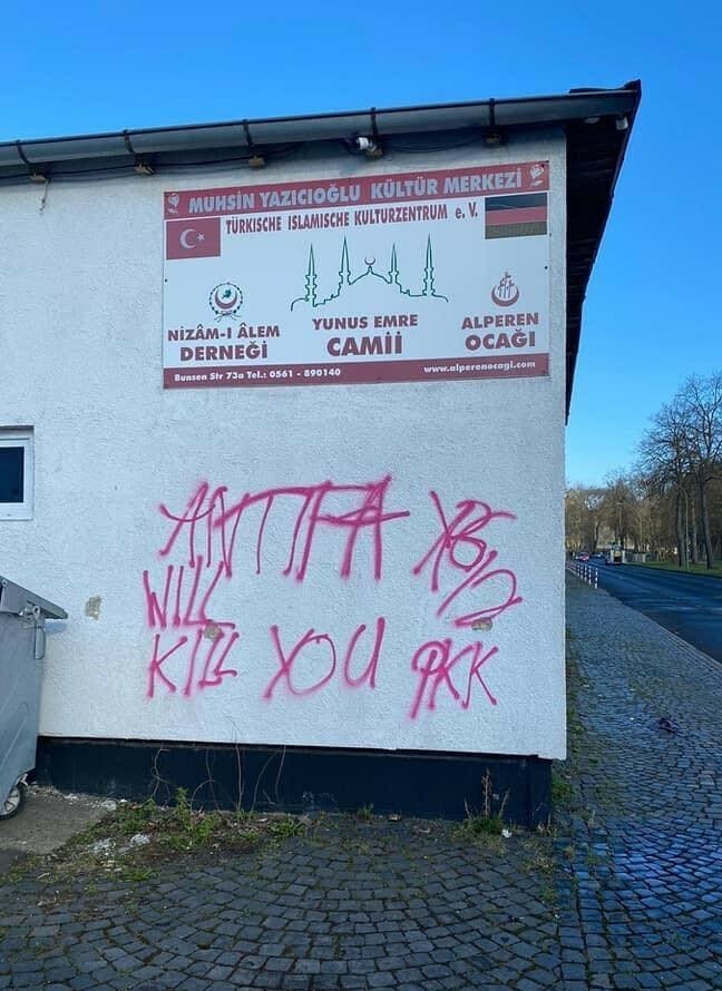 Almanya’nın Kassel kentinde terör örgütü PKK mensupları Muhsin Yazıcıoğlu Kültür Merkezi ile Yunus Emre Camisi’nin duvarına hakaret ve tehdit içerikli yazılar yazdı.