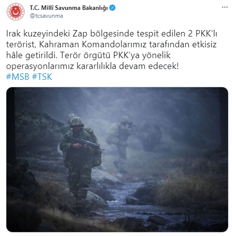 Yapılan açıklamada, "Irak kuzeyindeki Zap bölgesinde tespit edilen 2 PKK'lı terörist, kahraman komandolarımız tarafından etkisiz hale getirildi. Terör örgütü PKK'ya yönelik operasyonlarımız kararlılıkla devam edecek" ifadelerine yer verildi.