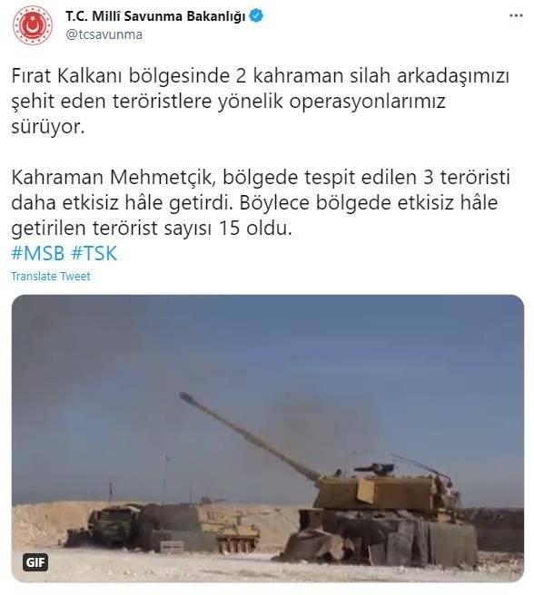 MSB'nin sosyal medya hesabından yapılan paylaşımda, Fırat Kalkanı bölgesinde 2 Mehmetçiği şehit eden teröristlere yönelik operasyonların sürdüğü belirtildi.