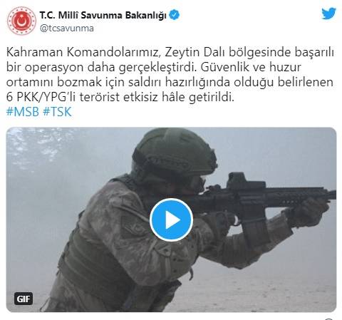 "Kahraman komandolarımız, Zeytin Dalı bölgesinde başarılı bir operasyon daha gerçekleştirdi. Güvenlik ve huzur ortamını bozmak için saldırı hazırlığında olduğu belirlenen 6 PKK/YPG'li terörist etkisiz hale getirildi."