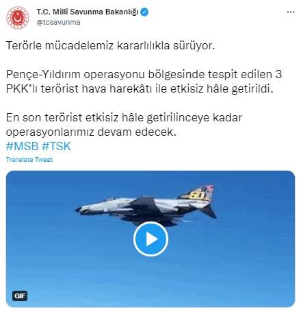 "Terörle mücadelemiz kararlılıkla sürüyor. Pençe-Yıldırım operasyonu bölgesinde tespit edilen 3 PKK’lı terörist hava harekâtı ile etkisiz hâle getirildi. En son terörist etkisiz hâle getirilinceye kadar operasyonlarımız devam edecek."