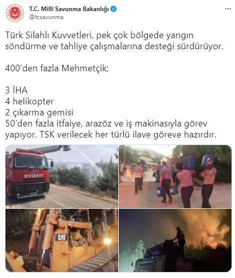 MSB'den yapılan açıklamada, "400’den fazla Mehmetçik; 3 İHA 4 helikopter 2 çıkarma gemisi 50’den fazla itfaiye, arazöz ve iş makinasıyla görev yapıyor. TSK verilecek her türlü ilave göreve hazırdır." ifadeleri kullanıldı.