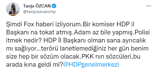 6'lı masa ile birlikte partisi CHP'nin de destek verdiği Ferhat Encü'yü yerden yere vuran Özcan, "Şimdi Fox haberi izliyorum. Bir komiser HDP İl Başkanı'na tokat atmış. Adam az bile yapmış. Polisi itmek nedir?" diye sordu.