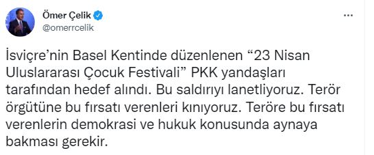 Resmi sosyal medya hesabından açıklamada bulunan AK Parti Genel Başkan Yardımcısı, Parti Sözcüsü Ömer Çelik, “İsviçre’nin Basel Kentinde düzenlenen ‘23 Nisan Uluslararası Çocuk Festivali’ PKK yandaşları tarafından hedef alındı. Bu saldırıyı lanetliyoruz. Terör örgütüne bu fırsatı verenleri kınıyoruz. Teröre bu fırsatı verenlerin demokrasi ve hukuk konusunda aynaya bakması gerekir” dedi.