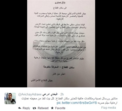 "Gazze sakinlerine askeri bildiri, İsrail ordusu, terör saldırılarının amacına ulaşmasını engelleyecek ve Hamas ile diğer terörist gruplara bağlı tüm terör unsurlarını ve onlara ait alt yapıları vuracak. Sakin bir hayat isteyen Gazzelilerin taleplerini ve ihtiyaçlarını görmezden gelen, yeraltında gizlenen Hamas liderlerini takibe devam edeceğiz. Güvenliğiniz için çevresinde terörist saldırıların düzenlendiği her ev vurulacak. Terör elemanlarının mülkiyetiniz altındakileri kullanmasına izin vermeyin. Terörist faaliyetlerin gerçekleştirildiği yerlerden hemen uzaklaşın. Biz uyardık, sorumluluk kabul etmiyoruz"
