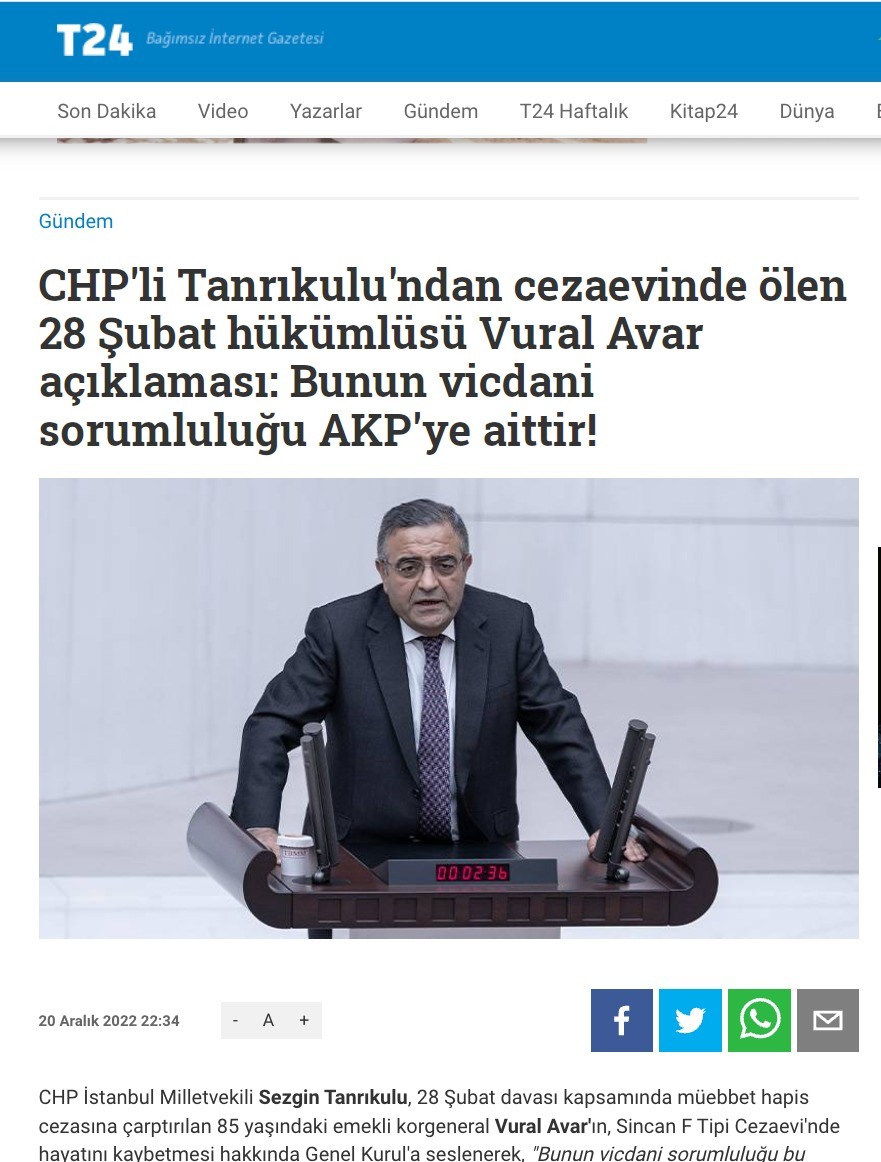 CHP Milletvekili Tanrıkulu 2012 yılında "Hiç kimse 14 ay boyunca kendi iradesi olsa bile tecrit koşullarında bırakılamaz. O koşulların ortadan kaldırılması lazım" sözleriyle teröristbaşı Apo'ya destek çıkmıştı. Şimdi ise Türkiye'nin demokrasi tarihinde kara bir leke olan 28 Şubat döneminin Genelkurmay Plan ve Prensipler Dairesi Başkanı Korgeneral Vural Avar'a sahip çıktı.