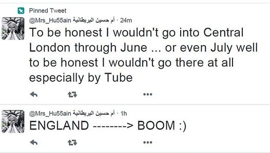 DAEŞ'in en tanınmış militanlarından "Bayan Terör" lakaplı Sally Jones, Twitter üzerinden İngiltere'yi tehdit etti. İlk paylaşımında "Ben olsam Haziran'da Londra'da bulunmazdım... Hatta Temmuz'da da. Dürüst olmak gerekirse oraya hiç gitmezdim, özellikle de metroyla" diyen Jones, bir sonraki tweet'inde de "İngiltere--->BOOM!" yazdı.