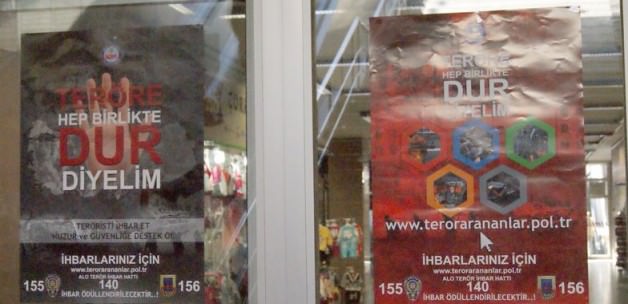 Terör olaylarına dair fotoğrafların da yer aldığı uyarı afişlerinin üzerinde, "Teröre hep birlikte dur diyelim. İhbarlarınız için Alo terör ihbar hattı 140. İhbar ödüllendirilecektir.