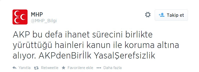 Çözüm sürecini ‘ihanet süreci’ olarak değerlendiren ve CHP'ye vagon olarak siyasi arenada son demlerini yaşayan MHP, “AKPdenBirİlk YasalŞerefsizlik” etiketi ile hakaretten de kaçınmadı. MHP’nin bu üslubu birçok kullanıcının tepkisini çekerken, bazı takipçiler, “Bu ülkede kan durduğunda MHP diye bir parti de kalmayacak. O yüzden sızlanıyorsunuz” yorumları yaptı.