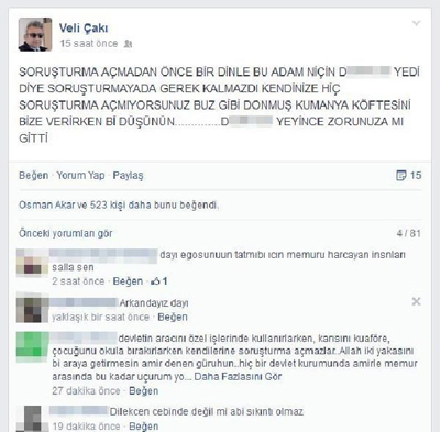 Çakı'nın sözleri üzerine yanındaki polis arkadaşlarının cep telefonuyla kaydedilen görüntü ve sözleri Facebook'a yüklendi. Çakı'nın kendi sayfasından da paylaştığı video Facebook'ta 7 binden fazla beğeni aldı, binlerce kez de izlendi. Görüntünün yayılması üzerine Veli Çakı'yı makamına çağıran ve tepki gösterdiği belirtilen Trabzon Emniyet Müdürü Murat Köksal, ayrıca soruşturma açılması talimatını verdi.