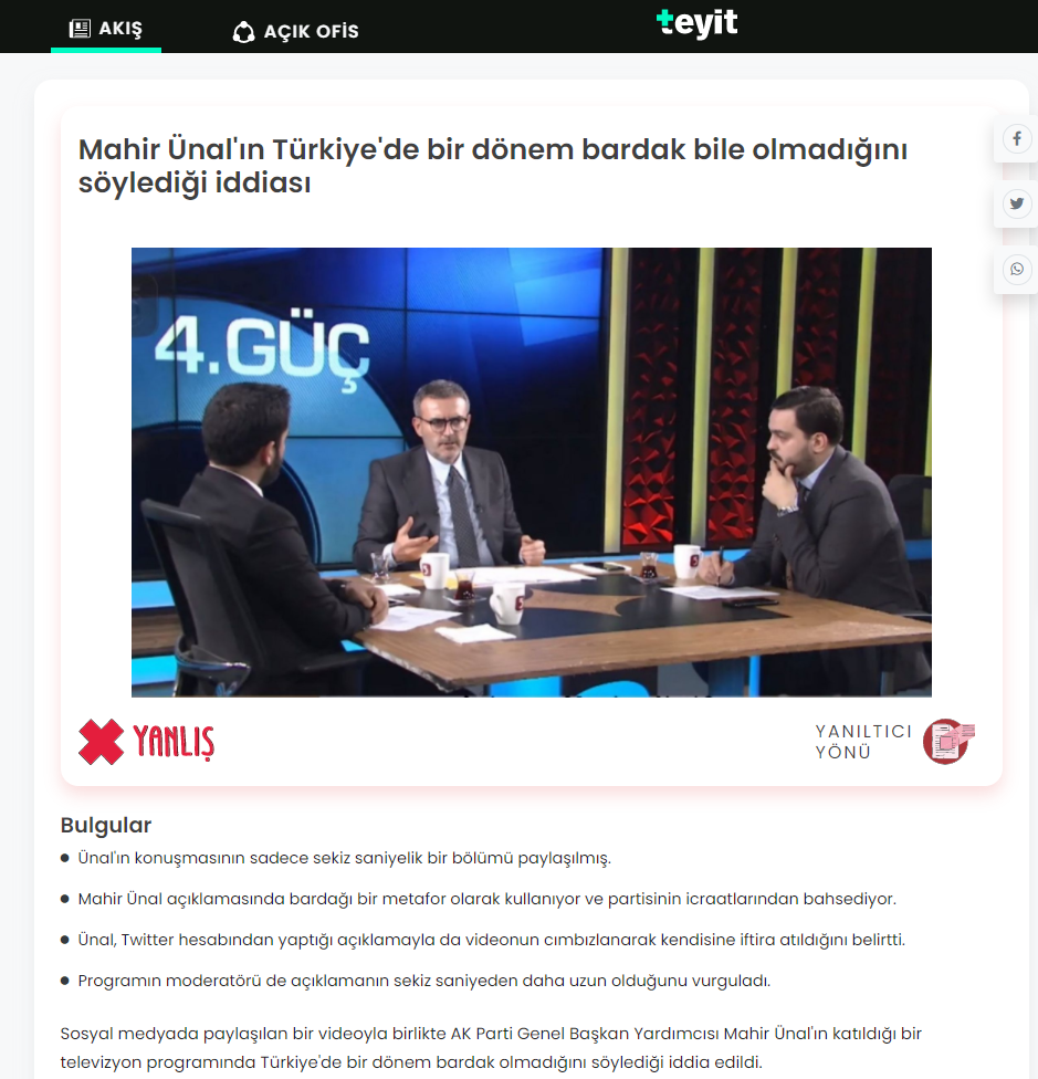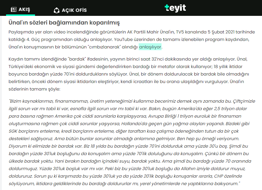 "Paylaşımda yer alan video incelendiğinde görüntülerin AK Partili Mahir Ünal'ın, TV5 kanalında 5 Şubat 2021 tarihinde katıldığı 4. Güç programından olduğu anlaşılıyor. YouTube üzerinden de tamamı izlenebilen program kaydından, Ünal'ın konuşmasının bir bölümünün 'cımbızlanarak' alındığı anlaşılıyor."