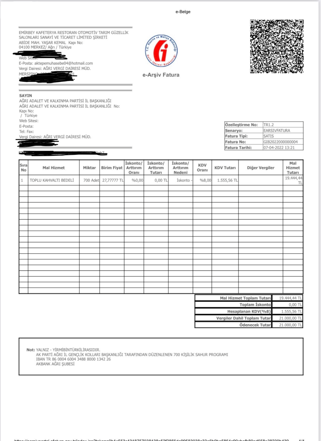 Fatura üzerinde yer alan rakamlar incendiğinde, 700 kişilik organizasyon için kişi başı 27 lira 77 kuruş bedel belirlendiği görülüyor. Rakamlar çarpıldığında faturadaki 19444,39 TL’ye erişilebiliyor. Bu rakama yüzde 8 KDV yani bin 555 lira eklendiğinde 20 bin 999 lira yani 21 bin TL’ye erişiliyor.