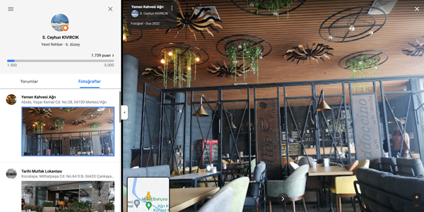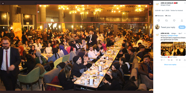 Organizasyonun yapıldığı faturadaki adresi Google Haritalar üzerinden aradığımızda sahur yemeğinin yapıldığı işletmenin adının Ağrı Yemen Kahvesi olduğu görülüyor. Videosu yayılan ve Ağrı AK Gençlik Twitter hesabı üzerinden paylaşılan fotoğrafları bu adresle kıyasladığımızda buluşmanın burada yapıldığı doğrulanabiliyor. Tavanda yer alan yuvarlak dekoratif ışıklar, birbirini tutuyor.