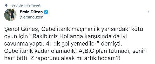 Hollanda - Türkiye maçı 3-0 iken bir tweet atan Ersün Düzen; "Şenol Güneş, Cebelitarık maçının ilk yarısındaki kötü oyun için "Rakibimiz Hollanda karşısında da iyi savunma yaptı. 41 dk gol yemediler" demişti. Cebelitarık kadar olamadık! A,B,C plan tutmadı, senin harf bitti. Z raporunu alsak mı artık hocam?!" ifadelerini kullanmıştı.