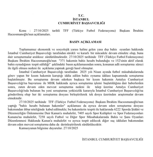 "Toplumumuz ekonomik ve sosyolojik yarası haline gelen yasa dışı bahis oyunları hakkında İstanbul Cumhuriyet Başsavcılığı tarafından sürekli ve kararlı bir mücadele devam etmekte olup, buna dair soruşturmalar aralıksız sürdürülmektedir. 27/10/2025 tarihinde TFF (Türkiye Futbol Federasyonu) Başkanı İbrahim Hacıosmanoğlu'nun "371 hakemin bahis hesabı bulunduğu ve 152'sinin aktif olarak bahis oynadığının tespit edildiği" şeklindeki basın açıklamasından sonra, konunun adli soruşturma süreci ile ilgili olması nedeni ile açıklama yapmak gereği hasıl olmuştur. İstanbul Cumhuriyet Başsavcılığı tarafından 2025 yılı Nisan ayında futbol müsabakalarında görev yapan bir kısım hakemin karıştığı iddia edilen bahis oynama iddiası kapsamında soruşturma başlatılmıştır. Bu soruşturma devam ederken başkaca bir kısım hakemin Antalya Cumhuriyet Başsavcılığı'na başvurusu ile MHK hakkında ayrıca soruşturma işlemi başlatıldığına dair haberlerden sonra, zaten devam eden mevcut soruşturma nedeni ile talep üzerine Antalya Cumhuriyet Başsavcılığı'nda bulunan bu yeni soruşturma yetkisizlik kararıyla İstanbul Cumhuriyet Başsavcılığı'na gönderilmiş olup her iki soruşturma dosyası birleştirilerek tek dosya üzerinden araştırmalar devam etmektedir.