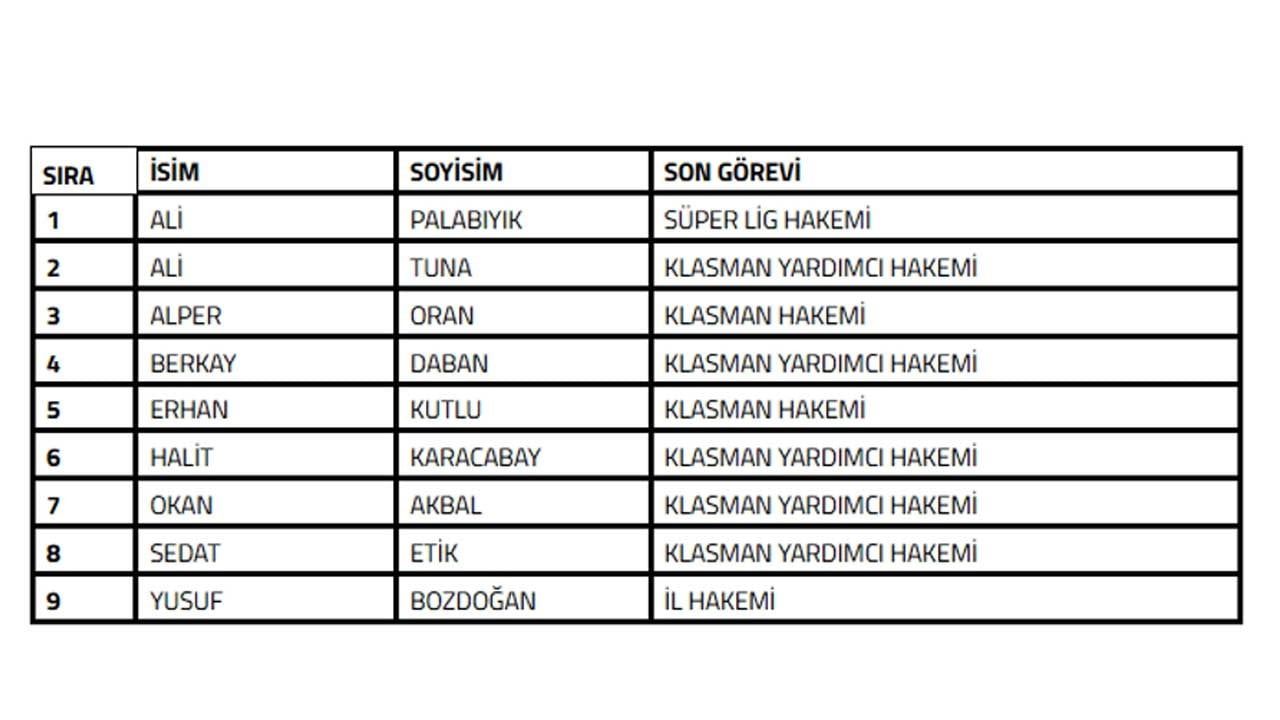 TFF açıklamasında, "Türkiye Futbol Federasyonu'nca yürütülen bahis soruşturması kapsamında; son 5 yılda TFF bünyesinde hakem olarak görev yapmış ve futbol dalında bahis oynadığı tespit edilen aşağıda isimleri yer alan kişilerin Futbol Disiplin Talimatı'nın 57. maddesi uyarınca 26.12.2025 tarihinden itibaren tedbirli olarak PFDK'ya sevk edilmesine karar verilmiştir." ifadelerine yer verdi.