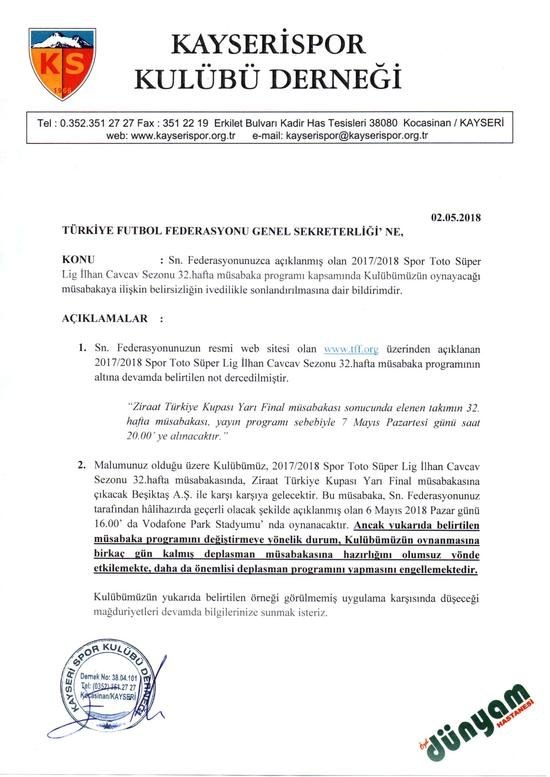 İşte Kayserispor'un TFF'ye gönedrdiği yazı...