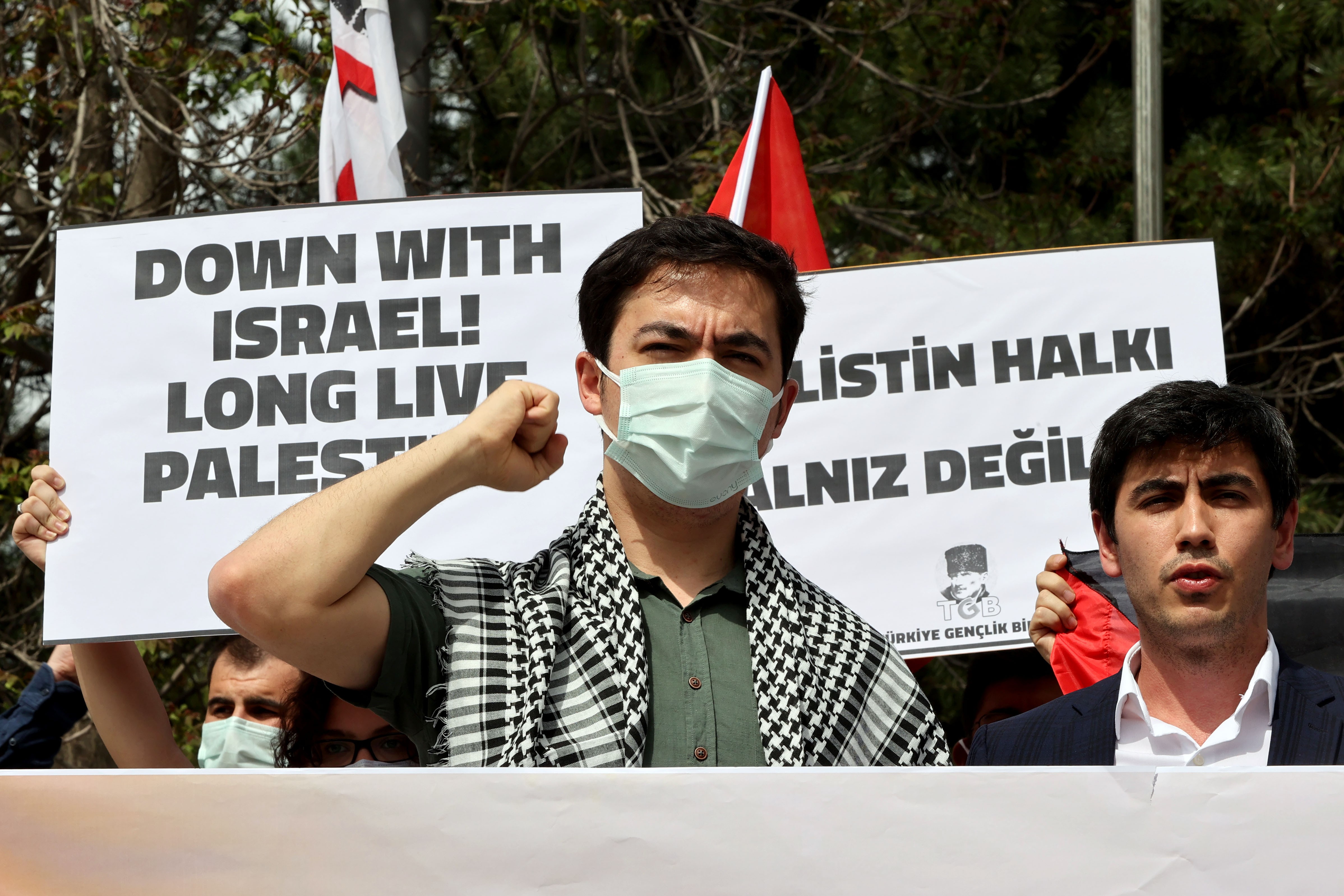 Mescid-i Aksa'ya müdahale eden İsrail'in Filistin'de uyguladığı vahşeti kınayan Türkiye Gençlik Birliği üyeleri, İsrail'in Ankara Büyükelçiliği önünde basın açıklaması yaptı.