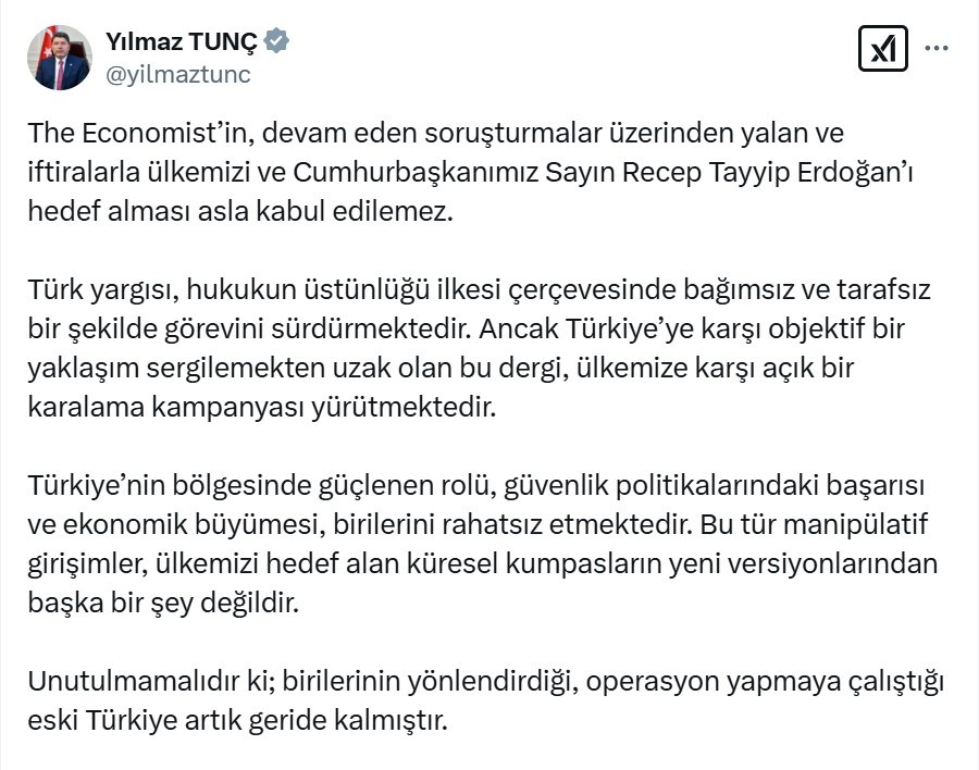 Adalet Bakanı Yılmaz Tunç, sosyal medya hesabından yaptığı açıklamada, "The Economist'in, devam eden soruşturmalar üzerinden yalan ve iftiralarla ülkemizi ve Cumhurbaşkanımız Sayın Recep Tayyip Erdoğan'ı hedef alması asla kabul edilemez. Türk yargısı, hukukun üstünlüğü ilkesi çerçevesinde bağımsız ve tarafsız bir şekilde görevini sürdürmektedir. Ancak Türkiye'ye karşı objektif bir yaklaşım sergilemekten uzak olan bu dergi, ülkemize karşı açık bir karalama kampanyası yürütmektedir. Türkiye'nin bölgesinde güçlenen rolü, güvenlik politikalarındaki başarısı ve ekonomik büyümesi, birilerini rahatsız etmektedir. Bu tür manipülatif girişimler, ülkemizi hedef alan küresel kumpasların yeni versiyonlarından başka bir şey değildir. Unutulmamalıdır ki birilerinin yönlendirdiği, operasyon yapmaya çalıştığı eski Türkiye artık geride kalmıştır. Karanlık odakların hazırladığı bu kirli senaryolara asla boyun eğmeyeceğimizi herkes bilmelidir. The Economist ve benzeri çevrelerin dezenformasyon kampanyalarına karşı dimdik durmaya, Cumhurbaşkanımızın liderliğinde, milletimizin desteğiyle dünyada söz sahibi olmaya, daha da güçlenmeye ve büyümeye devam edeceğiz" ifadelerini kullandı.