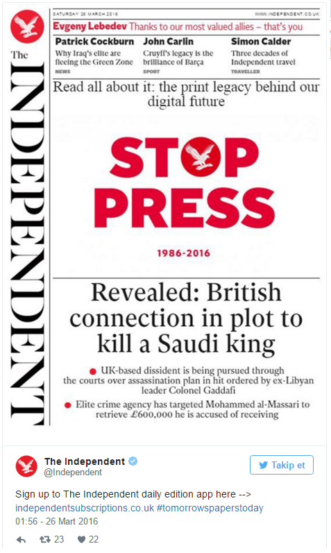 Yoluna dijitalde devam etme kararı alan İngiltere’nin en saygın gazetelerinden The Independent, son kez baskıya gitti.