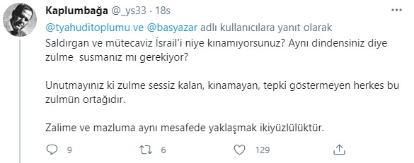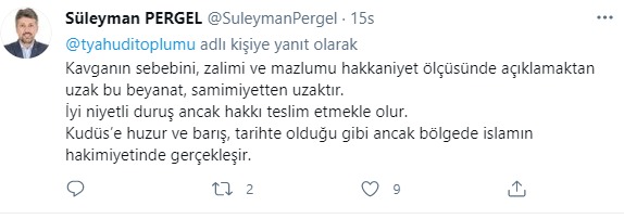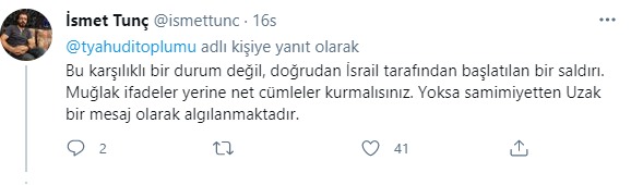 Türkiye Hahambaşılığı Vakfı yaptığı paylaşımda işgalci İsrail’in Filistinli mazlumlara yaptığı soykırımına vurgu yapmadan yarım ağız kınama mesajı yayınladı. Söz konusu mesajda, “Ramazan bayramı arifesinde, herbirine saygı duyduğumuz İbrahimi dinler ve kültürler için kutsal olan Kudüs'te yaşanan son gelişmeleri büyük bir üzüntü ve endişe ile takip ediyoruz. Bu bağlamda, bir an evvel barışçıl bir çözüm bulunması için ele ele verilmesini ve şiddetin yerini kucaklaşmaya bıraktığı bir mübarek Ramazan bayramının sulh ve huzur içinde geçmesini Yüce ALLAH’tan diliyor, dua ediyoruz” ifadeleri yer aldı. Söz konusu paylaşım altına yorum yapan sosyal medya kullanıcıları ise, “Saldırgan ve mütecaviz İsrail'i niye kınamıyorsunuz? Aynı dindensiniz diye zulme susmanız mı gerekiyor? Unutmayınız ki zulme sessiz kalan, kınamayan, tepki göstermeyen herkes bu zulmün ortağıdır. Zalime ve mazluma aynı mesafede yaklaşmak ikiyüzlülüktür”, “Bu karşılıklı bir durum değil, doğrudan İsrail tarafından başlatılan bir saldırı. Muğlak ifadeler yerine net cümleler kurmalısınız. Yoksa samimiyetten Uzak bir mesaj olarak algılanmaktadır”, “Kavganın sebebini, zalimi ve mazlumu hakkaniyet ölçüsünde açıklamaktan uzak bu beyanat, samimiyetten uzaktır. İyi niyetli duruş ancak hakkı teslim etmekle olur. Kudüs’e huzur ve barış, tarihte olduğu gibi ancak bölgede islamın hakimiyetinde gerçekleşir” ifadeleri ile sözde kınama mesajına tepki gösterdiler.