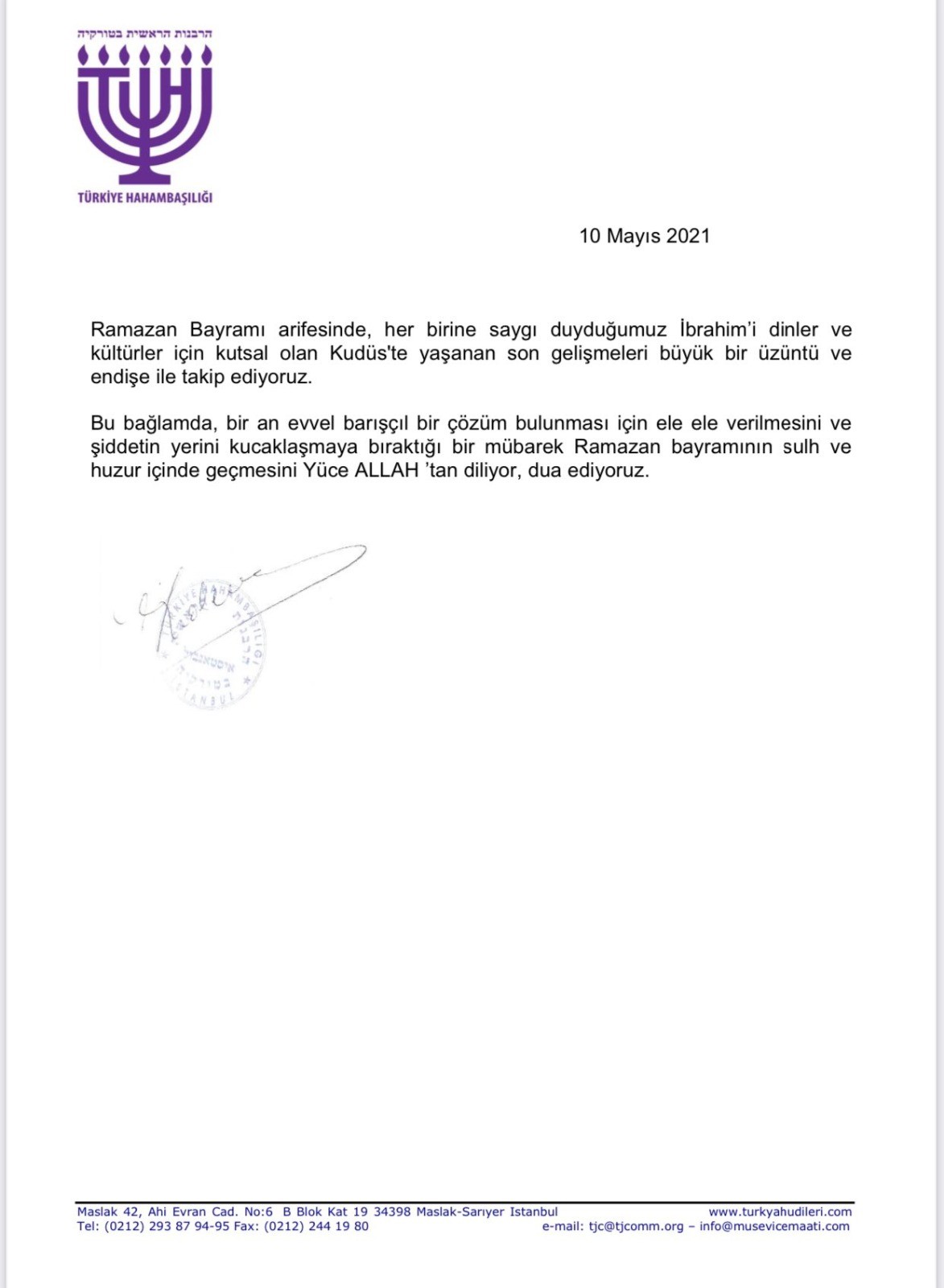 Türkiye Hahambaşılığı Vakfı yaptığı paylaşımda işgalci İsrail’in Filistinli mazlumlara yaptığı soykırımına vurgu yapmadan yarım ağız kınama mesajı yayınladı. Mesajda, “Ramazan bayramı arifesinde, herbirine saygı duyduğumuz İbrahimi dinler ve kültürler için kutsal olan Kudüs'te yaşanan son gelişmeleri büyük bir üzüntü ve endişe ile takip ediyoruz” ifadelerine sosyal medya kullanıcılarından tepki geldi.
