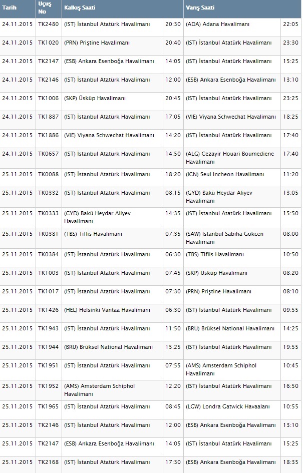THY'nin web sitesinde yer alan açıklamaya göre, 25-26 Kasım'da İstanbul Atatürk Havalimanı'nda beklenen güneyli rüzgar ve bu nedenle kesişen pist operasyonuna bağlı kapasite kısıtı nedeniyle iç ve dış hatta 56 sefer iptali yaptı.