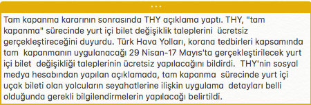 Türk Hava Yolları (THY), koronavrüs tedbirleri doğrultusunda 29 Nisan Perşembe akşamı saat 19:00’dan 17 Mayıs sabah saat 05:00’e kadar sürecek şekilde tam kapanmaya geçildi. Tam kapanmanın uygulanacağı süreçte yolcuların biniş kartlarını havaalanlarından almaları gerektiğini bildirdi.