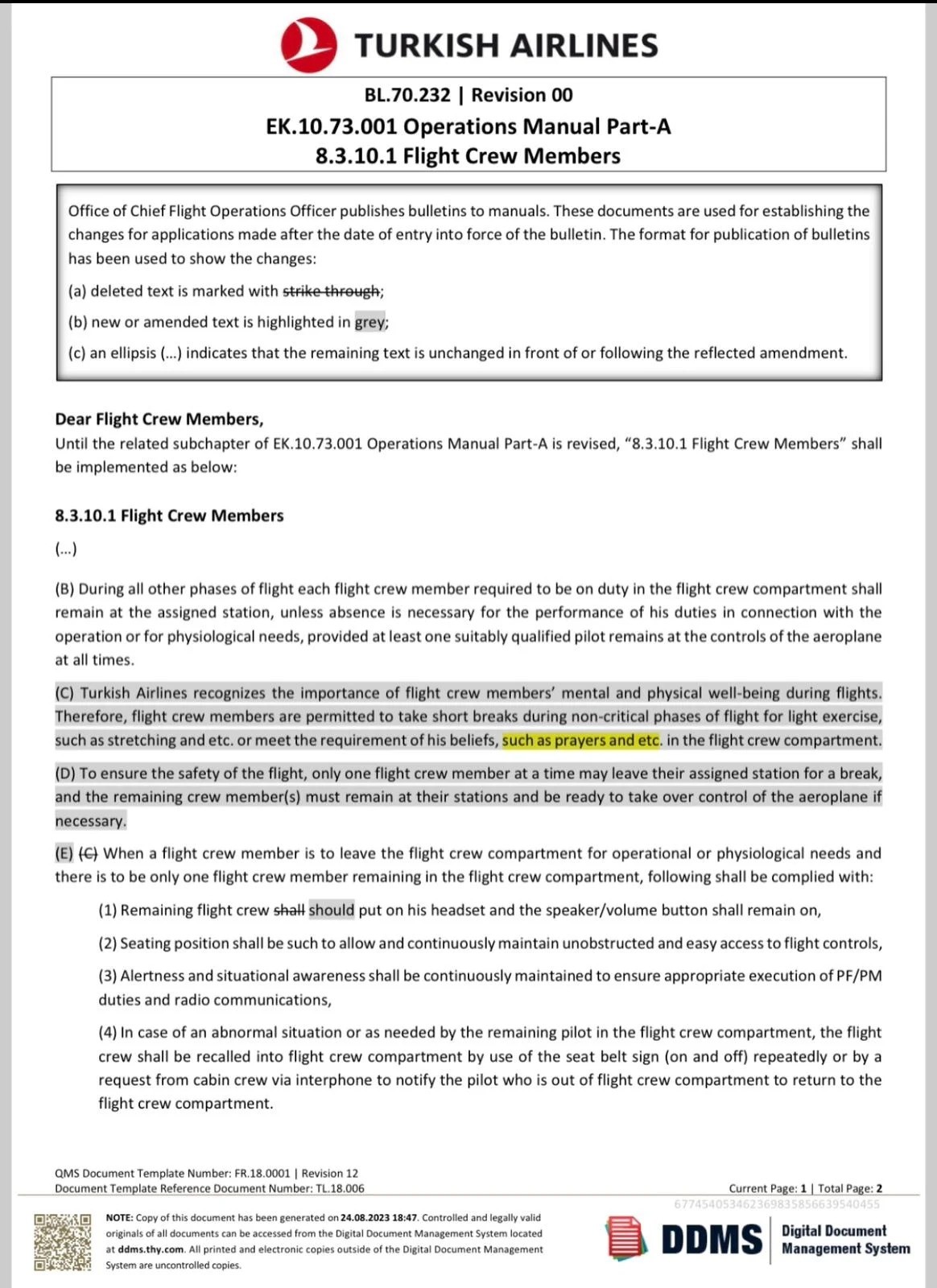"Türk Hava Yolları, uçuş sırasında uçuş mürettebatının zihinsel fiziksel sağlığına önem vermektedir. Bu nedenle, uçuş ekibi üyelerinin uçuşun kritik olmayan aşamalarında esneme ve hafif egzersizler için kısa molalar vermesine veya kokpitte dua etme, inancının gereğini yerine getirmesine izin vermektedir."