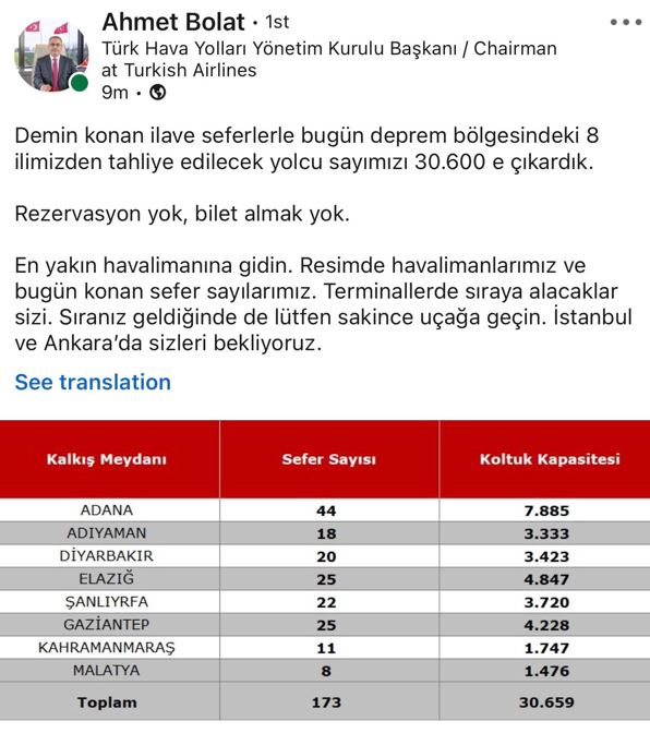 THY Yönetim Kurulu ve İcra Komitesi Başkanı Prof. Dr. Ahmet Bolat, Kahramanmaraş'ta meydana gelen ve 16 binden fazla can kaybının yaşandığı deprem bölgelerinden ücretsiz ve randevusuz olarak ek seferlerin gerçekleşeceğini açıkladı.