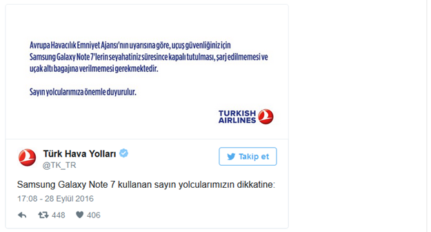 Türk Hava Yolları'nın resmi twitter hesabı üzerinden yayımladığı bildiride, Samsung Galaxy Note 7 marka/modelli telefonların Avrupa Havacılık Emniyet Ajansı'nın uyarısına göre, uçuş güvenliğiniz için seyehat süresince kapalı tutulması, şarj edilmemesi ve uçak altı bagajına verilmemesi gerekmektedir.
