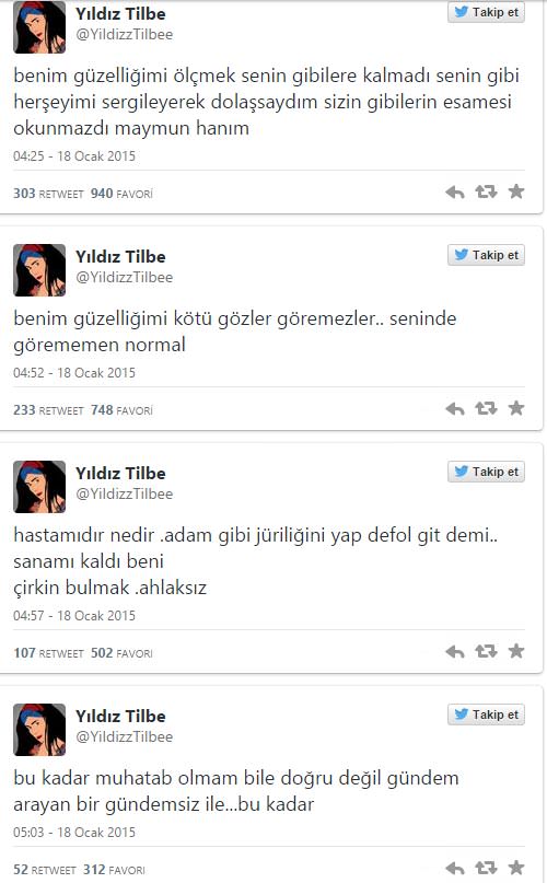 Bu sözüyle Yıldız Tilbe'ye çirkin dediğinin farkında olmayan Hülya Avşar, daha sonra "Tabii ki Yıldız beni yanlış anlamasın, çirkin vesaire demedim" diyerek durumu toparlamaya çalıştı. Avşar'ın bu sözlerine hayli kızan Tilbe, tepkisini Twitter'da dile getirdi. "Benim güzelliğimi ölçmek senin gibilere kalmadı" diyen Tilbe, ağır sözler sarf etti.