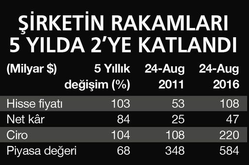 ABD'li teknoloji devi Apple'da yaşanan zorunlu bayrak devrinin üzerinden 5 yıl geçti. Şirketin efsanevi kurucusu Steve Jobs'ın kanser tedavisi nedeniyle zorunlu olarak 24 Ağustos 2011'de CEO koltuğuna oturan Tim Cook, geçen süre içerisinde inişli çıkışlı bir dönem yaşadı. Beş yılın ardından Cook'un karnesine bakıldığında ise bilançoların rekorlarla dolu olduğu görülüyor. Toplam satışlar rekor artış gösterirken 2011'de yıllık 108 milyar dolar olan ciro 2016'da 220 milyar dolara yükseldi. Net kâr ise 47 milyar dolara ulaşırken şirketin piyasa değeri de zaman zaman 700 milyar doları aştı. Kasada biriken 220 milyar dolar ise çok sayıda satın almaya yetecek seviyede.