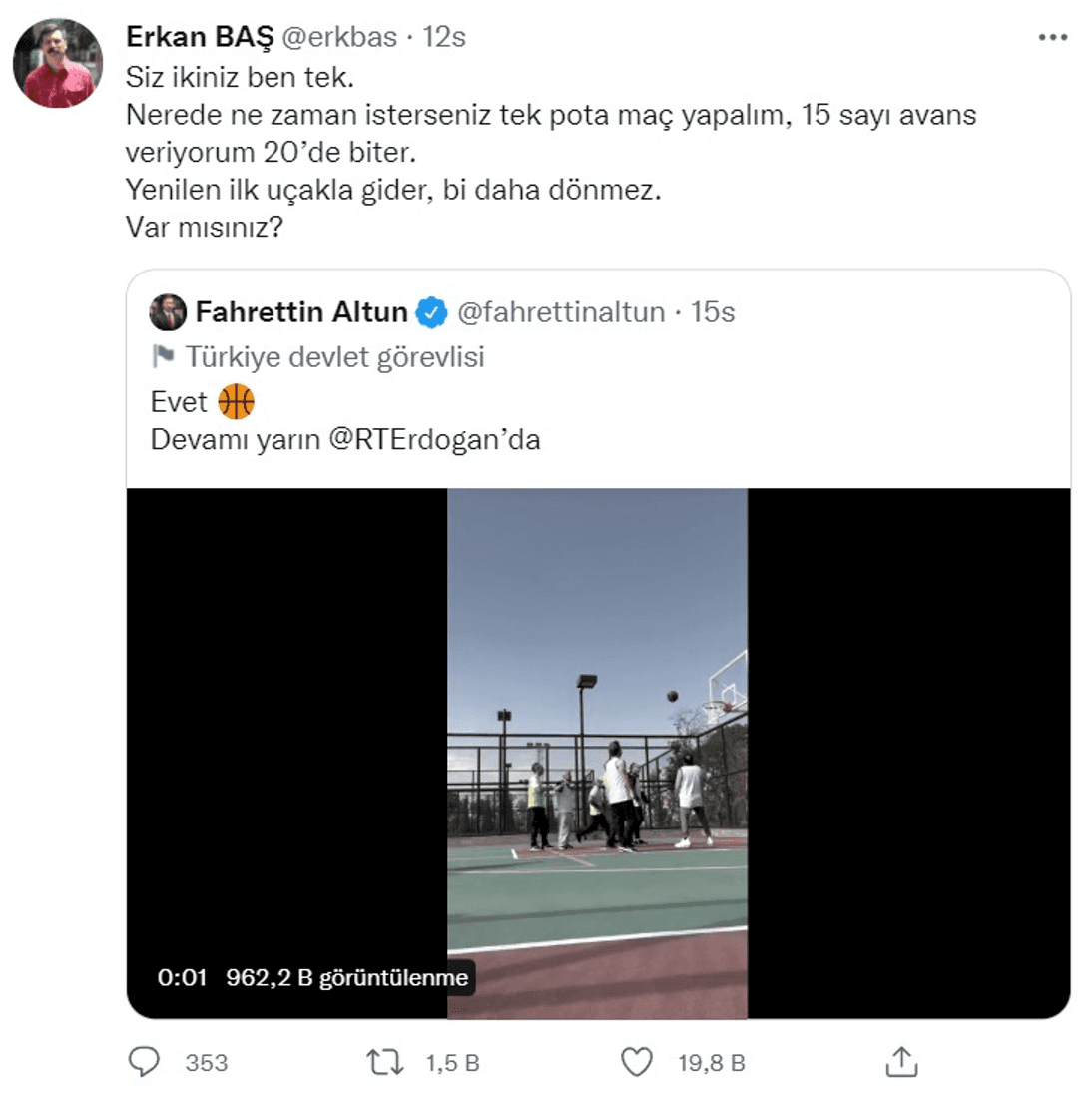 Türkiye İşçi Partisi (TİP) Genel Başkanı Erkan Baş, Cumhurbaşkanı Erdoğan'ın basketbol oynadığı görüntüleri kıskandı. TİP bünyesinde kendisi ve birkaç yancısından başka kimse olmadığı için yalnızlıktan bunalıma giren Baş, oyuna dahil olmak istedi. "Beni de oynatın" diye tutturan Baş, Twitter hesabından güldüren bir paylaşım yaptı. TİP Başkanı Baş, "Siz ikiniz ben tek. Nerede, ne zaman isterseniz, tek pota maç yapalım, 15 sayı avans veriyorum 20'de biter. Yenilen ilk uçakla gider, bi daha dönmez. Var mısınız?" diyerek aklınca meydan okudu.