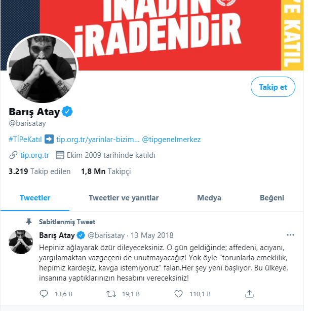 Bir diğer TİP'li Barış Atay da, dokunulmazlık kılıfını kuşandıktan sonra twitter hesabına şu mesajı sabitledi: