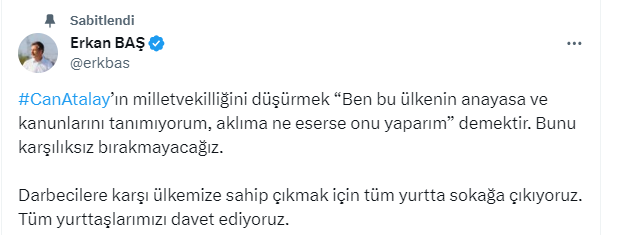 TİP'li Gezi kalkışmacısı Can Atalay'ın milletvekilliğinin düşürülmesinin ardından Erkan Baş, sokağa çıkma çağrısı yaptı.
