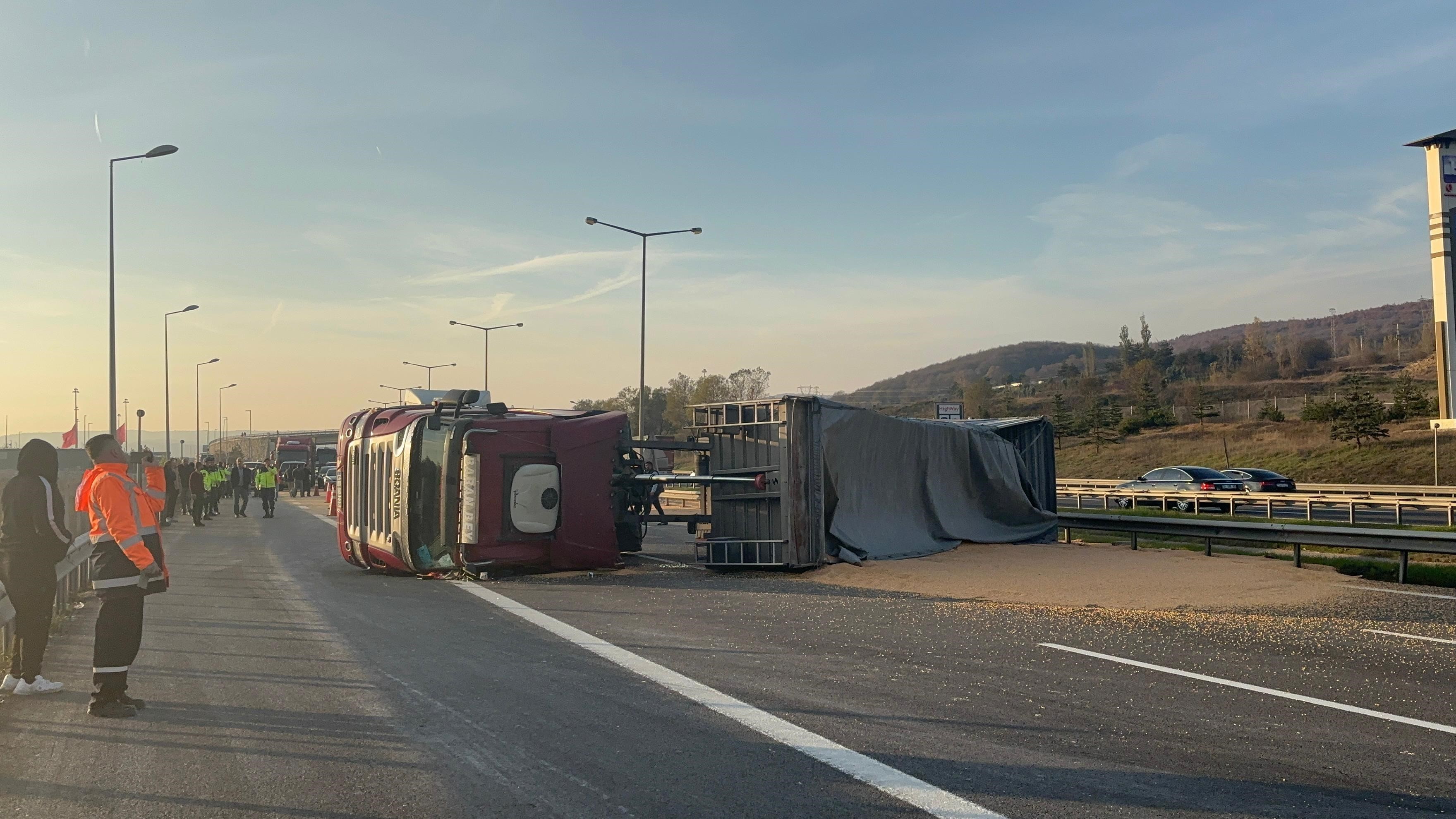 TEM Otoyolu'nun Bolu geçişinde mısır yüklü tır devrildi. Maddi hasarlı atlatılan kazada Otoyolun Ankara istikameti trafiğe kapatıldı.