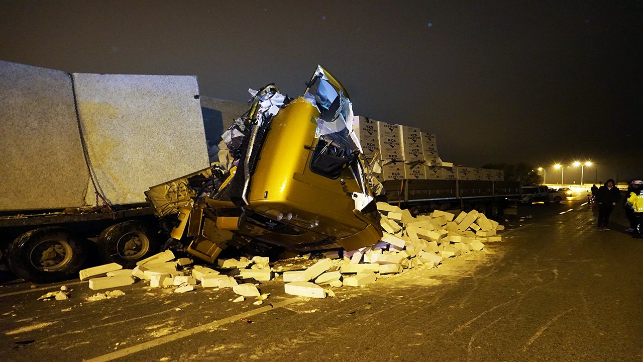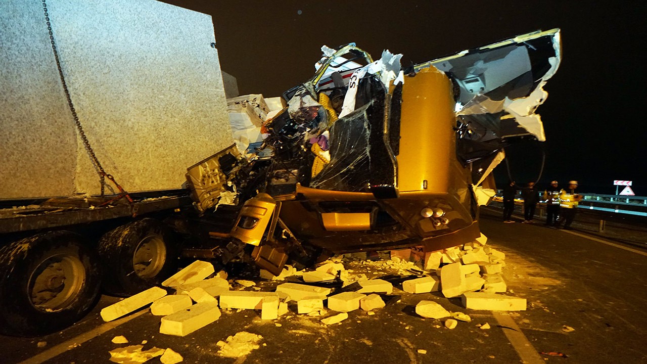 Kenan Akçay’ın kullandığı 06 DRZ 153 plakalı gazbeton yüklü tır, aynı yönde ilerleyen Fuat Sarıışık’ın kullandığı 03 BS 299 plakalı tıra arkadan çarptı. Çarpışmanın etkisiyle tırların kabinleri hasar görürken, Akçay kabinde sıkıştı.
