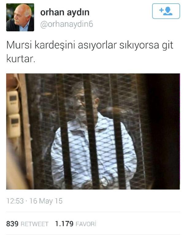 Aydın, “Mursi kardeşini asıyorlar. Sıkıysa git kurtar” diye yazdı. Aydın’ın sözleri Cumhurbaşkanı Recep Tayyip Erdoğan’ı kastettiği şeklinde yorumlandı.