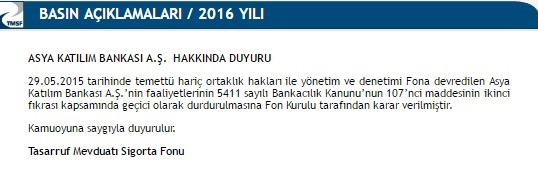 Tasarruf Mevduatı Sigorta Fonu, Bank Asya'nın faaliyetlerinin geçici olarak durdurulduğunu açıkladı.