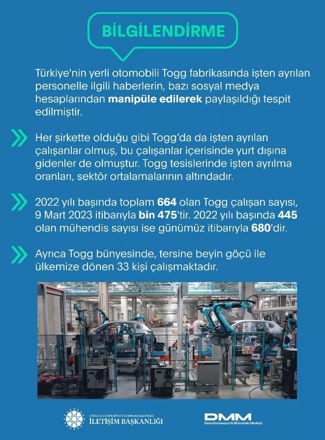 Türkiye'nin yerli otomobili Togg fabrikasından işten ayrılan personel konusu sosyal medyada yanıltıcı bir şekilde ele alındı. Dezenformasyonla Mücadele Merkezi, Togg tesislerindeki işten ayrılma oranlarının sektör ortalamasının altında olduğunu belirterek bu algı operasyonunun gerçeği yansıtmadığını açıkladı. Togg'da her şirkette olduğu gibi işten ayrılan çalışanlar bulunduğunu belirten açıklamada, Togg tesislerindeki toplam çalışan sayısının 9 Mart 2023 itibarıyla bin 475'e yükseldiği bildirildi. Ayrıca Togg bünyesinde tersine beyin göçü ile ülkemize dönen 33 kişi çalışmaktadır.