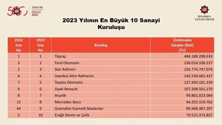ISO 500 listesi net satışa göre ve TL bazında hazırlandı. TÜPRAŞ üretimden satışlarda 484,2 milyar lirayla Türkiye’nin en büyük sanayi kuruluşu unvanını elde ederken, 2022'de üçüncü sırada olan Ford Otomotiv 238 milyar lirayla ikinciliğe yükseldi. Geçen yıl ikinci sırada bulunan Star Rafineri ise 226,8 milyar liralık üretimden satışla 3'üncü oldu.