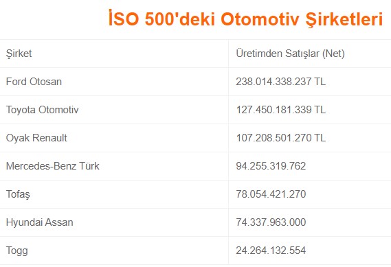 Türkiye'nin Otomobili Girişim Grubu (Togg), 2023’ün Mart ayında satışlara başlamıştı. Kısa sürede yüksek satış miktarına ulaşan Togg, ISO 500 listesine 42’inci sıradan girmeyi başardı. Şirketin 2023’teki net satışı 24 milyar 345 milyon 916 bin 198 TL olarak gerçekleşti. Özkaynak, aktifleri, dönem kâr/zarar rakamı ve çalışan sayısı gibi diğer verileri açıklanmadı. Togg, 2023’te yaklaşık 20 bin otomobil satışı yaptı.