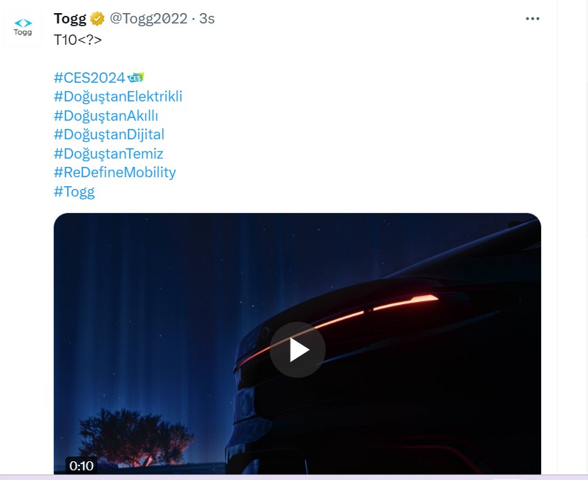 Togg'un yeni modelinin daha önce açıklanan model isimlendirme sistemine göre "T10S" adıyla piyasaya çıkacağı tahmin ediliyor TOGG, tüketici elektroniği ve bilişim fuarı CES 2024'te sergilenmesi beklenen yeni sedan modeline ilişkin ilk tanıtım videosunu paylaştı.