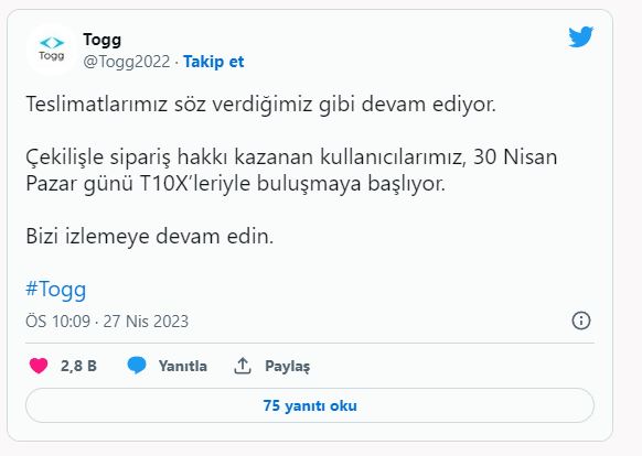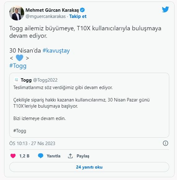 Öte yandan Togg Üst Yöneticisi (CEO) Gürcan Karakaş da kendi sosyal medya hesabından konuya ilişkin olarak, "Togg ailemiz büyümeye, T10X kullanıcılarıyla buluşmaya devam ediyor. 30 Nisan'da kavuştay." açıklamasında bulundu.
