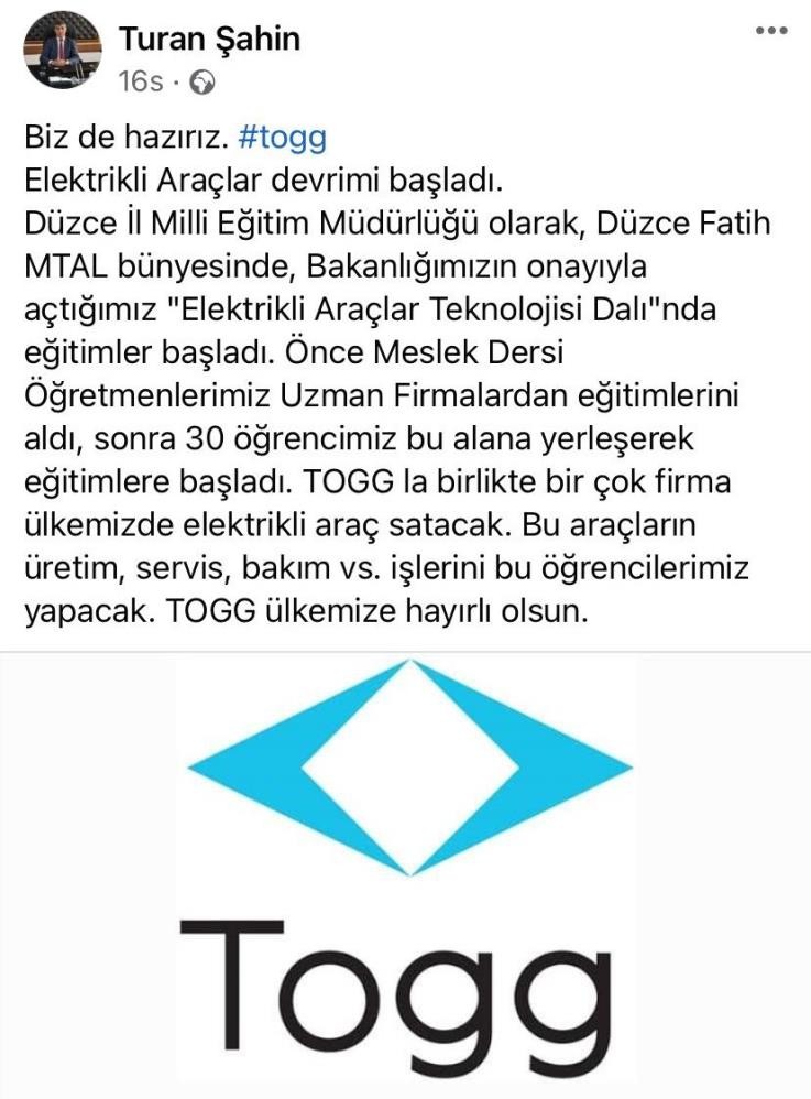 Konuya ilişkin sosyal medya hesabından açıklama yapan İl Milli Eğitim Müdür Yardımcısı Turan Şahin, "Biz de hazırız. Elektrikli Araçlar devrimi başladı. Düzce İl Milli Eğitim Müdürlüğü olarak, Düzce Fatih MTAL bünyesinde, Bakanlığımızın onayıyla açtığımız Elektrikli Araçlar Teknolojisi Dalı'nda eğitimler başladı. Önce meslek dersi öğretmenlerimiz uzman firmalardan eğitimlerini aldı, sonra 30 öğrencimiz bu alana yerleşerek eğitimlere başladı. TOGG'la birlikte birçok firma ülkemizde elektrikli araç satacak. Bu araçların üretim, servis, bakım işlerini bu öğrencilerimiz yapacak. TOGG ülkemize hayırlı olsun" dedi.